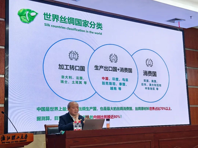 浙江理工大学校长陈文兴以《守护丝绸产业,传承中华文明》为题,开展专题解读,从历史文化、加工工艺、产业格局、科技创新四大维度,系统阐释产业价值与发展路径。陈校长追溯丝绸与天然纤维的文明起源及考古实证,通过“蚕、茧、丝、帛”等汉字演变、经典成语及上古传说,具象呈现丝绸文化与中华文明的深度交融,详解缫丝、织造至服装生产全链条工艺,梳理世界丝绸产业中心变迁。聚焦丝绸产业科技创新,他介绍了丝绸原料获取突破、缫丝智能化绿色化转型、纱线工艺革新以及人工智能赋能设计、蚕丝健康材料研发进展,强调教育体系构建与人才培养的重要性,为产业高质量发展、传承中华优秀传统文化提供有力支撑。