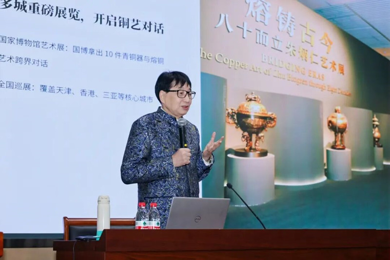 中国工艺美术大师、铜雕技艺国家级非遗代表性传承人朱炳仁以《创艺术高度、求经济深度》为题,介绍了其自身艺术与经济成果双突破的实践经验。朱炳仁铜总部园区锚定“国内标杆、世界一流”的发展定位,致力于打造集创作、展示、体验于一体的全方位铜艺术殿堂;在市场布局方面,朱炳仁铜屋持续强化线下场景渗透,打造6大艺术中心,全国范围内非遗生活体验馆247家,同时构建全球化艺术展览矩阵,通过国际化布局持续赋能品牌价值提升。此外,朱炳仁的作品多次亮相全球舞台,彰显中国艺术实力与文化底蕴。他积极艺术 与经济跨界融合,形成“艺术家经济学”典范,其艺术探索横跨诗、书、画、印、铜雕制品创作,以及建筑、时装、哲学等多个领域,实现传统文化艺术的全方位创新发展。